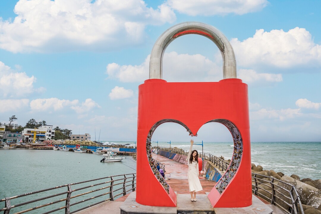 연인, 가족, 친구 사이의 사랑과 우정을 소원하는 일명 '사랑의 자물쇠' 포토존이다. 자물쇠 몸체가 하트 모양으로 음각돼 있는 모습으로 조형물이 멋진 프레임을 만들어준다. 붉은 자물쇠와 푸른 바다가 어우러져 그림 같은 풍경을 연출한다. 인공 조형물 포토 존을 만났다면 이제는 자연이 빚어낸 천연 포토 존을 만날 차례다.