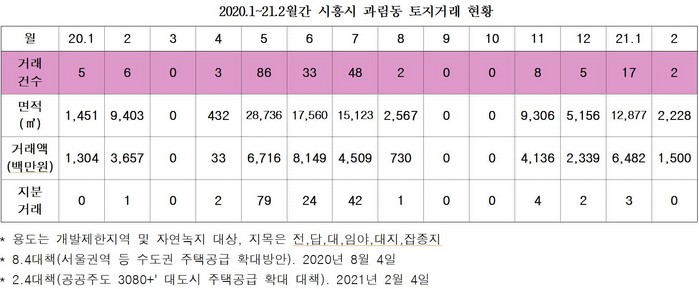 2020년 8월 2건에서, 9월 0건, 10월 0건으로 시흥시 과림동의 거래는 뜸했으나, 11월들어 8건(41.3억원)으로 늘어났고, 12월 5건(23.3억원)에 이어 2021년 1월에는 17건으로(64.8억원) 또다시 거래건수가 치솟았다. 그리고 다음달인 2월, 시흥시는 제3기 신도시로 추가 지정되었다. 정부대책 직전, 개발지역 선정을 앞두고 토지 거래 추세가 '수상하게'움직인 셈이다.