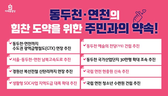 또한 "동두천·연천 주민들이 공감하고 체감할 수 있는 실현 가능하고 현실성 있는 민생공약을 준비한 만큼 주민 여러분의 삶이 한 단계 더 도약할 수 있도록 반드시 공약을 실천하겠다."고 각오를 다졌다.
