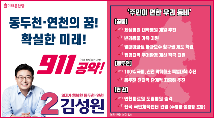 [환경데일리 문종민 기자]김성원 미래통합당(경기 동두천‧연천) 후보가 제21대 총선 911 공약(5대 분야 91개 1(일)하는 공약) 중 복지환경분야의 주민복지 공약을 발표했다.