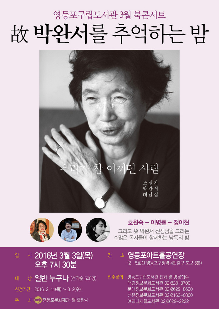 [환경데일리 이은수 기자] 영등포구(구청장 조길형)가 3월 3일 소설가 고 박완서 선생의 5주기를 맞아 영등포아트홀 공연장에서 (故)박완서를 추억하는 밤 북콘서트를 개최한다.