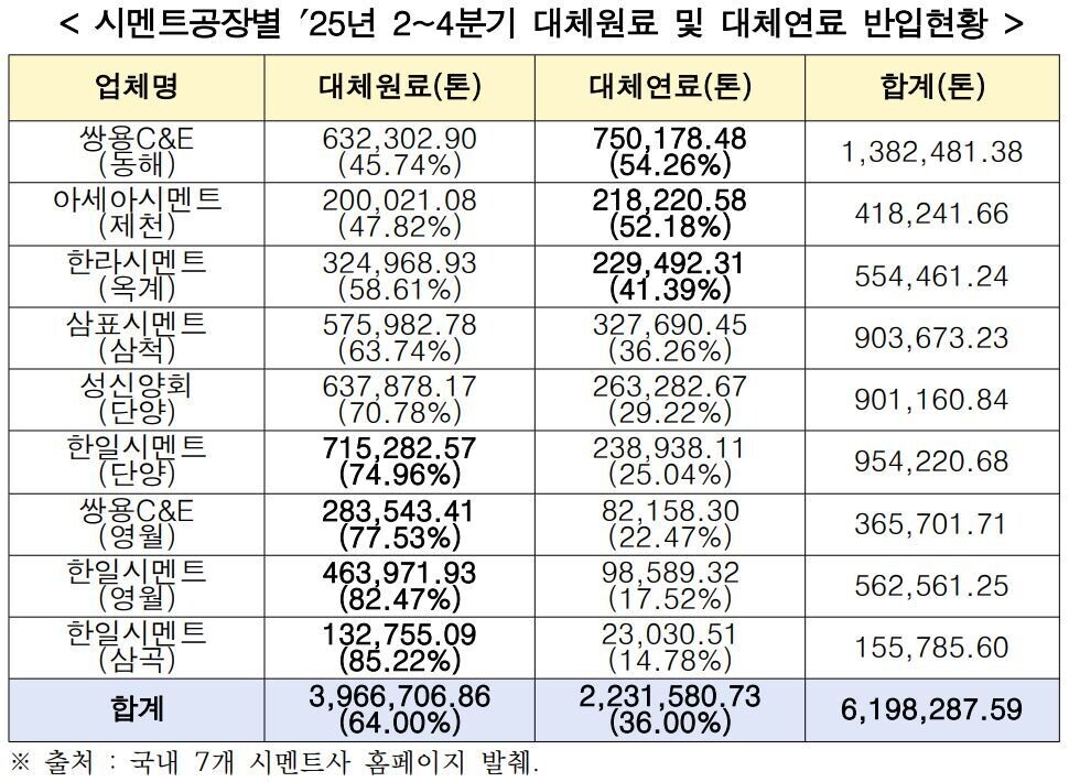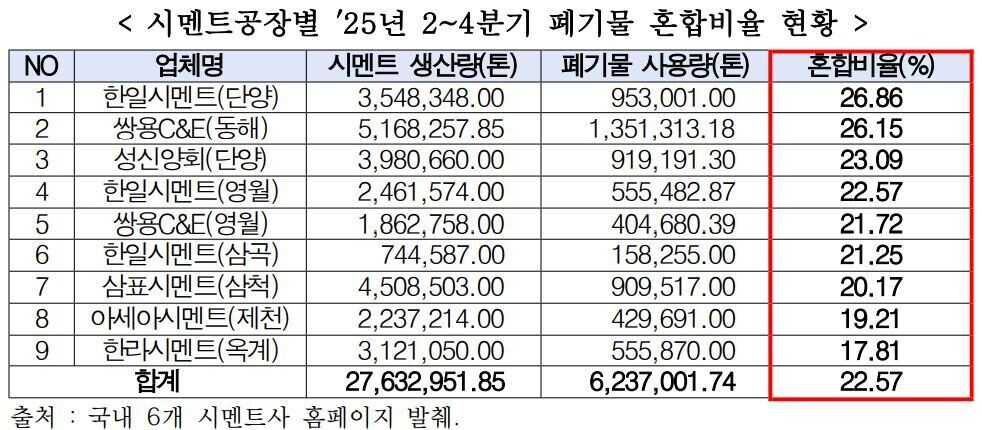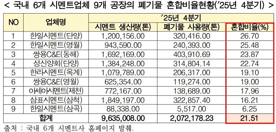 ′26년 1월 15일 공개된 ′25년 4분기 폐기물 혼합비율은 한일현대시멘트를 합병(′25.11.1)한 한일시멘트 단양·영월공장이 25%를 넘어설 정도로 압도적으로 높았다.