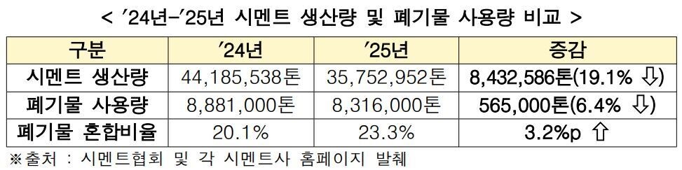 자료공개가 이뤄지지 않아 일부 추정치를 적용해 ′24년과 ′25년의 시멘트 생산량과 폐기물 사용량을 비교해본 결과, 시멘트 생산량이 줄어도 폐기물 혼합비율은 오히려 증가하고 있다. 지난해 시멘트생산량은 3575만 톤으로 ′24년 4418만 톤에 비해 843만 톤(19.1%) 줄었다.