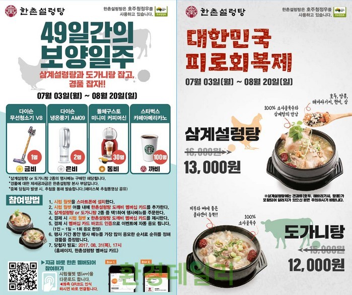 한식 프랜차이즈 전문기업 이연FnC(대표 정보연)는 한촌설렁탕 전국 매장에서 여름 극복 보양 메뉴 '삼계설렁탕'과 '도가니탕'을 3000원 할인된 금액으로 판매하고 다이슨 무선청소기 등 다양한 경품을 선물로 제공하는 '49일간의 보양일주' 고객 감사 이벤트를 실시한다고 3일 밝혔다.