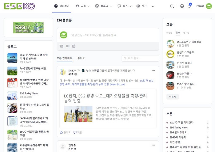 메뉴는 타임라인, 멤버, 그룹, 블로그, 토론, ESG 캠퍼스, 채용 정보, 캠페인/세미나 등으로 다양하게 구성됐다.