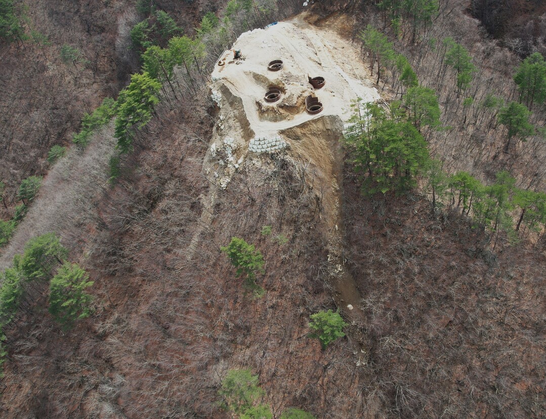 송전탑 부지 조성 과정에서 능선부 산지를 과도하게 절취하면서 발생한 토사와 암석이 급경사 사면과 계곡 방향으로 유출된 상태다. 봉화 지역 훼손지는 대부분 계곡 하류에 주민 주택이 위치하고 있어, 집중호우 시 토석류가 발생할 경우 직접적인 피해가 우려된다.