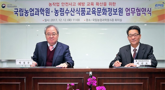[환경데일리 윤경환 기자]농림수산식품교육문화정보원(원장 박철수)은 농촌진흥청 국립농업과학원(원장 이진모)과 12일 전주 농과원 회의실에서 농작업 안전사고 예방 교육 확산을 위한 업무협약을 체결했다고 밝혔다.