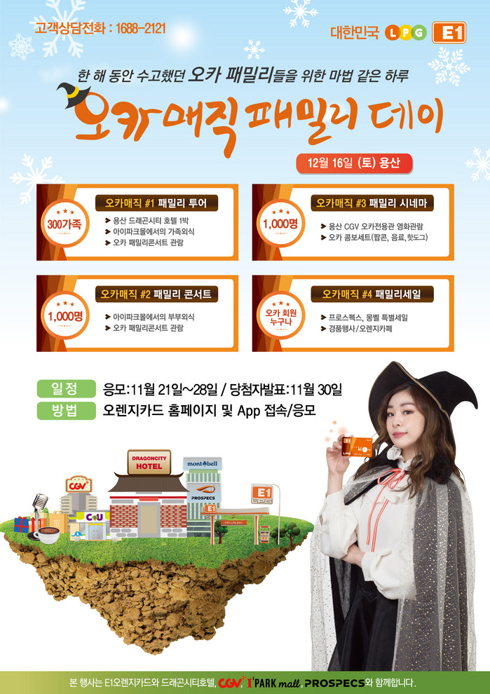 한편, E1은 김연아가 마법사로 등장해 오렌지카드 고객에게 혜택을 제공하는 내용의 신규 오카매직 광고 영상도 21일 공개한다.