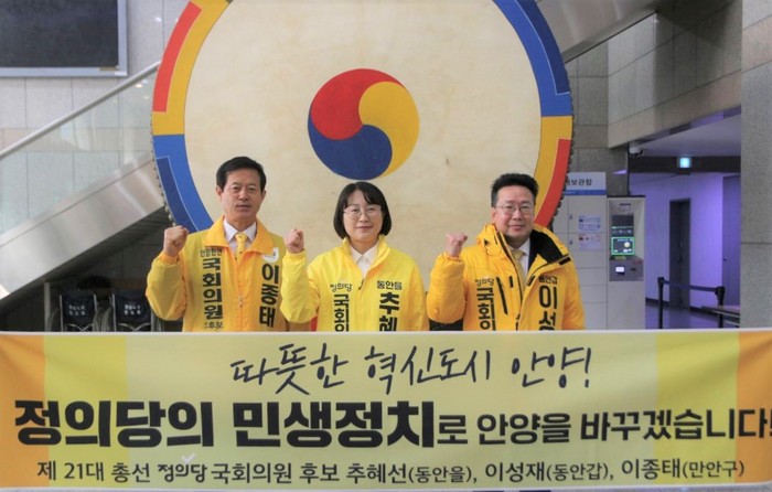 기자회견에 참석한 3명의 후보들은 지난 1일부터 4일까지 진행된 정의당 당원들의 투표를 거쳐 정의당 전국위원회 인준 절차를 통해 정의당의 안양시 3개 지역구 후보로 최종 선출됐다.