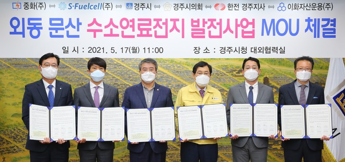 17일 시청 대외협력실에서는 주낙영 경주시장을 비롯해 서호대 시의장, 권욱 한전 경주지사장, 도.시의원, 중화(주) 이채근 대표, 에스퓨얼셀(주) 전희권 대표, 김요석 이화자산운용(주) 본부장, 관계공무원 등 20여 명이 참석해 수소연료 발전사업의 성공적 투자를 위한 업무협약을 체결했다.
