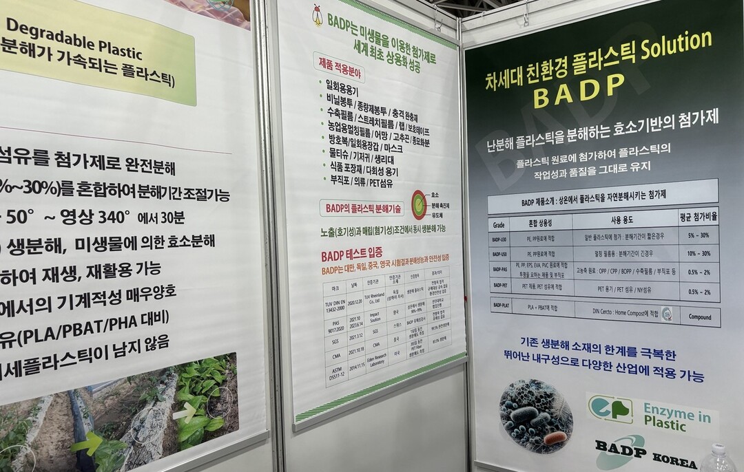 BADP 코리아 고신성 대표는 "실제로 일반 자연 상태에서 100% 생분해 전환이 가능하다."며 "우린 이미 세계적인 호평받을 미생물 효소기반의 첨가제 개발에 성공했다."고 밝혔다. 그러면서 "바로 대기업에서 조차 큰 관심사인 BADP(Bio Accelerated Degradable Plastic) 소재의 핵심기술에 키워드"라고 밝혔다.