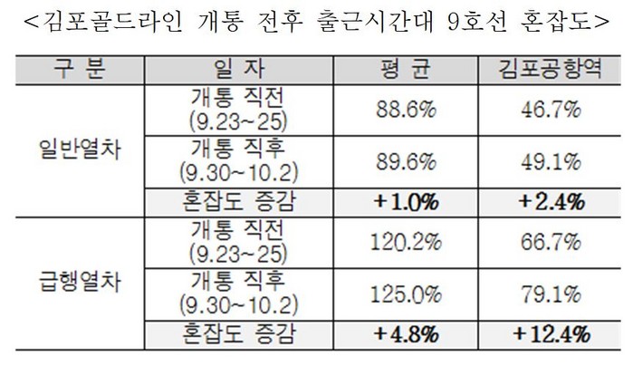 9호선 급행열차, 김포공항역 혼잡도 12.4% 증가