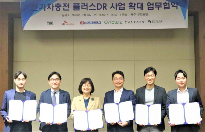 제10회 국제전기차엑스포가 열린 현장에서 한국전력(대표이사 사장 정승일)은 3일 DR사업자인 그리드위즈, 충전사업자인 SK일렉링크, 차지비, 스칼라데이터, 티비유와 '제주도 전기차충전 플러스DR 사업 확대'를 위한 협약 체결했다.