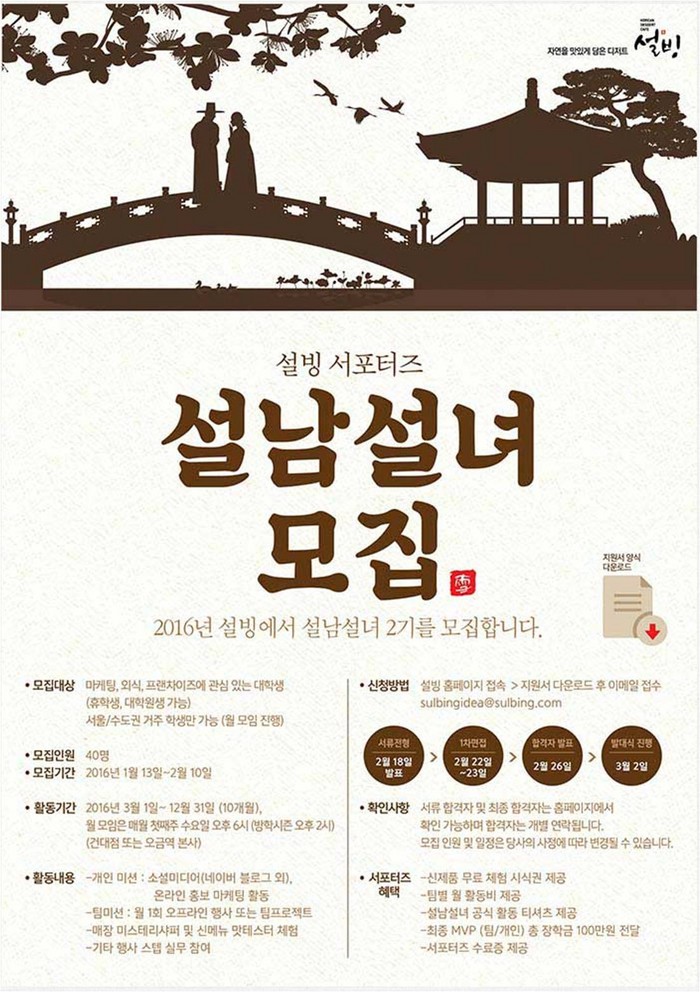자세한 내용은 설빙 홈페이지(http://sulbing.com)에서 확인할 수 있으며, 모집기간은 2월 10일까지이다. 최종 40명의 서포터즈를 선발하게 되며, 2월 26일 홈페이지를 통해 발표한다.