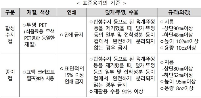 재활용 활성화를 위해 규격, 재질, 인쇄면적 등 1회용 컵의 표준용기에 대한 기준을 마련한다.