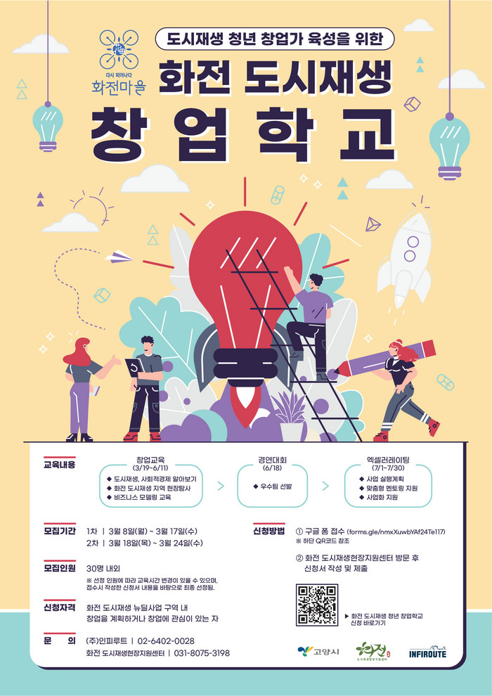 1차 모집기간은 3월 17일까지이고, 2차 모집기간은 3월 18일부터 24일까지다. 신청방법은 화전 도시재생현장지원센터로 방문해 신청서를 작성하거나 화전 도시재생 창업학교 포스터의 QR코드로 접속해 접수하면 된다.