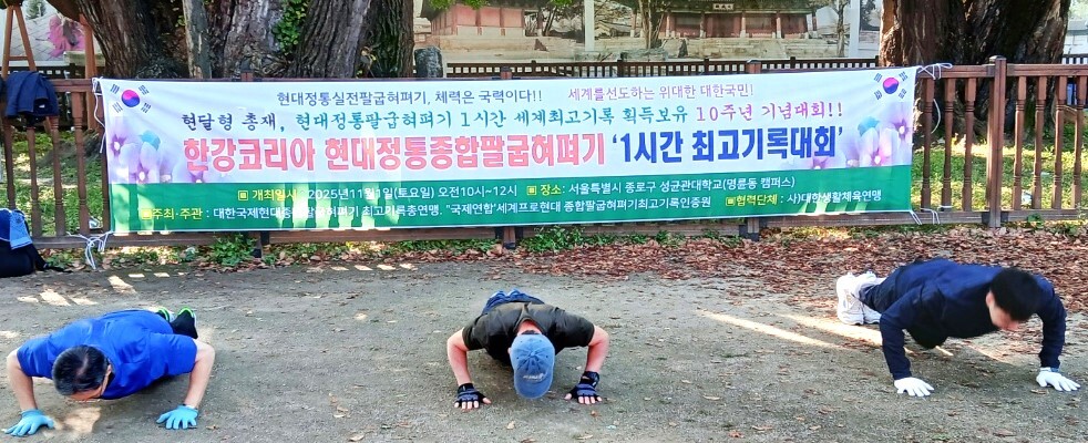 대한민국 실전 운동가이자 '현대정통팔굽혀펴기'창시자인 현달형 총재는 '한강코리아 현대 정통 종합 팔굽혀펴기 1시간 최고기록대회'를 11월 1일 성균관대 명륜당 앞마당에서 세계 기록에 도전에 나섰다.