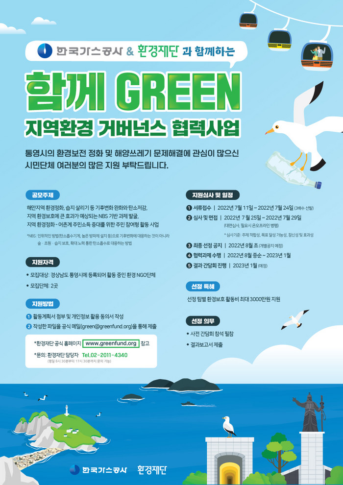 환경재단에 따르면 이번 공모주제는 한국가스공사(KOGAS)와 '함께 그린 지역환경 협력 공모사업'으로 통영시의 환경정화 및 해양쓰레기 문제 해결을 풀어내기 위해서다.