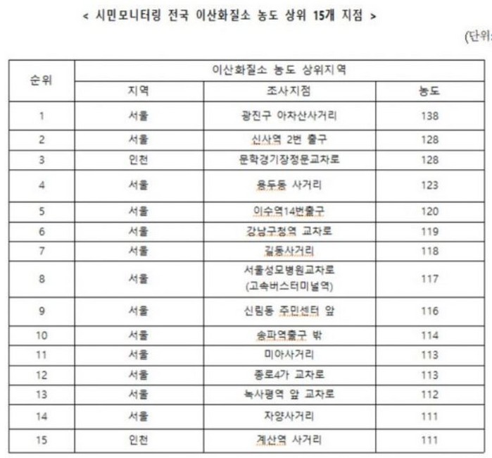 서울을 비롯한 대전, 광주, 인천, 부산, 원주, 광양만등 320여곳에서 동시에 시민모니터링을 진행한 결과 서울시 이산화질소 농도가 97ppb로 가장 나쁜 것으로 확인했으며 이중에서도 광진구 아차산 사거리가 138ppb로 가장 높았다.