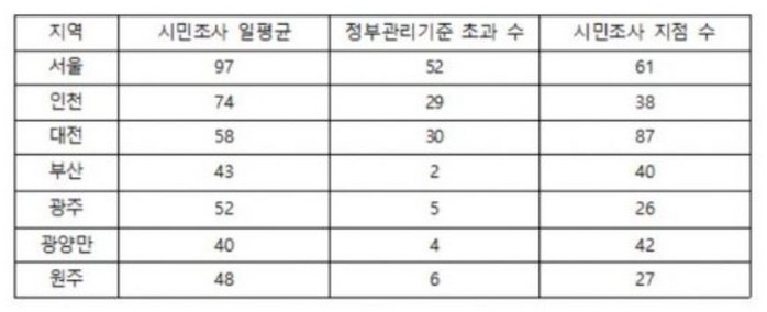 서울 다음으로 인천이 총 38개 지점에서 74ppb. 대전 87개 지점 58ppb, 광주 개 지점 52ppb, 부산 43ppb, 울산 32ppb 등 으로 확인됐다.