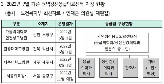 복지부는 고위험 정신질환자에 대한 대응과 치료를 강화하기 위해 24시간 권역정신응급의료센터 지정을 추진하고 있다. 올초 8개소를 지정하고 향후 매년 2개소씩 신규기관을 확대할 예정이었으나 2022년 9월 기준 권역정신응급의료센터로 지정된 의료기관은 4개소 뿐이다. 세 차례에 걸친 공모에도 의료기관의 사업 참여는 저조하다.