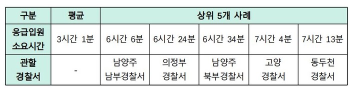 실제로 3월부터 6월까지 경기북부지방경찰청 관할지역 안에서 발생한 정신질환자 응급입원에는 평균 3시간 1분이 걸렸다. 소요시간이 가장 길었던 상위 5개 사례는 모두 6시간을 초과했다. 최장 7시 13분이 걸린 사례도 있었다. 그래도 이렇게나마 응급입원이 되면 다행이다.