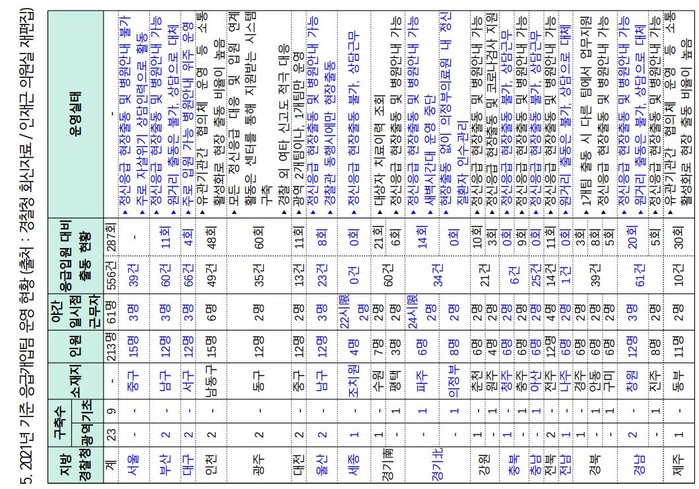 복지부의 정신응급의료기관 지정 수가 시범사업도 정비가 필요해 보인다. 해당 시범사업은 정신질환자가 응급입원할 경우 입원료 응급처치료 등에 100% 가산을 적용하는 내용으로 2021년 기준 16개 시도 21개 병원이 참여하고 있다.