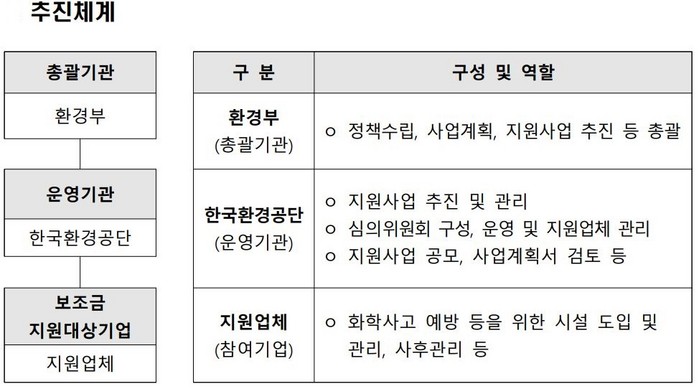 이 사업은 기존 한국환경공단의 중소기업 대상 행정·기술적 지원과 더불어 재정지원을 통해 중소기업의 취급시설 개선비용 부담을 완화하고 화학사고를 예방하기 위한 2022년 신규 사업이다.