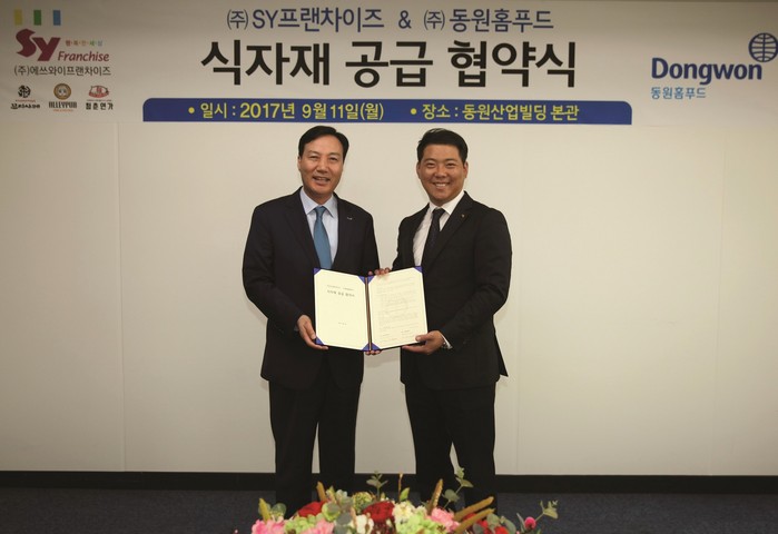 [환경데일리 정유선 기자]동원홈푸드(대표이사 신영수)가 11일(월) 동원그룹 본사에서 ㈜에쓰와이프랜차이즈(대표이사 김성윤)와 식자재 공급에 관한 업무 협약을 체결했다.