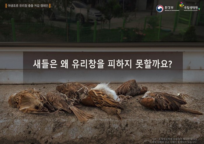 유리창에 충돌해 죽는 새들은 작은 새들이고, 그리고 충돌해 죽어도 금방 치워지거나 잡아 먹히기도 해서 보기가 어렵다. 주위에서 잘 보이지 않는 어이없는 죽음이 일어나고 있다. 국도변 방음벽이나 아파트 방음벽 아래를 유심히 지켜보면 보인다. 이런 죽음이 일어나고 있다는 사실을 알리는 것이 필요한 시기다.