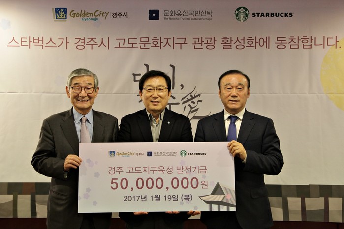 1월 19일 스타벅스 경주대릉원점에서 이석구 대표이사를 비롯해, 최양식 경주시장과 문화유산국민신탁 김종규 이사장이 함께 참석한 가운데 '경주고도지구육성 발전기금'으로 5000만원을 전달하는 자리가 개최됐다.
