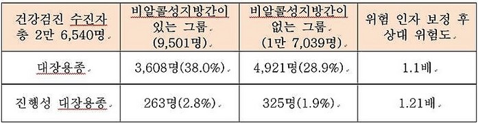전체 건강검진 수진자들을 나이, 성별, 흡연력, 음주력, 비만도, 대장암 가족력, 각종 대사성 질환 등 대장용종 발생에 영향을 미칠 모든 요인들로 보정했을 때, 비알콜성지방간이 있는 수진자들에서 비알콜성지방간이 없는 수진자들에 비해 대장용종 및 진행성 대장용종의 상대위험도가 각각 1.10배와 1.21배에 달했다.