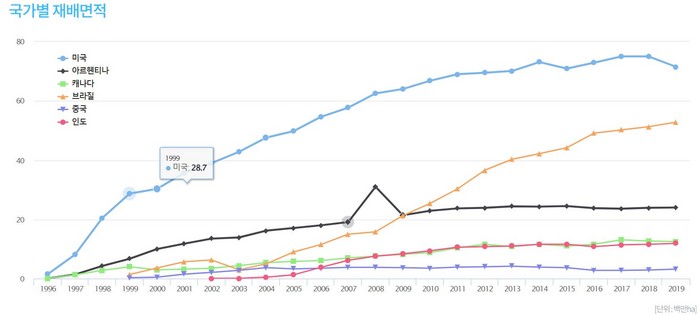 아이쿱연구소 자료를 보면, 1992~2016년 사이 승인된 유전자변형 사례는 전 세계에서 404건에 달한다. 최근 5년 사이는 10여 종이 더 늘었다. 2023년 3월 기준으로 식품용 LMO 수입승인은 옥수수 2억5355만1000톤, 대두 8억4726만4000톤에 집계됐다. 농업용 수입도 매년 크게 기록을 갱신하고 있다. 소 돼지 닭 사료 등 축산농가에 공급되는 식용옥수수만 40억 톤에 달한다