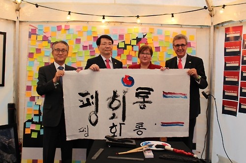 | ▲'평화통일기원' 글씨를 직접 써서 보여준 글라이케 독일 경제부 차관(오른쪽서 두번째) |