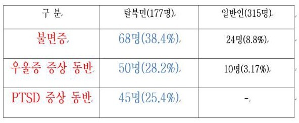 또한 일반인과 직접적 비교는 이뤄지지 않았지만 연구 참여 탈북민의 절반 가까이(40.1%, 71명)가 PTSD 증상을 보였고, 4명 중 1명꼴(25.4%)로 불면증이 함께 나타났다.