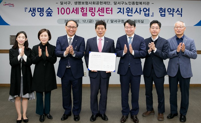 [환경데일리 윤경환 기자]생명보험사회공헌재단(이사장 이종서)은 12일 대구 달서구청에서 생명보험재단 조경연 상임이사, 달서구 이태훈 구청장 등이 참석한 가운데 대구 달서구와 '생명숲100세힐링센터' 운영사업에 대한 업무협약을 체결했다.