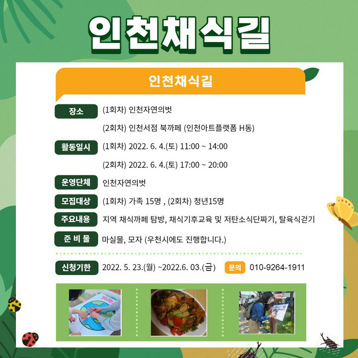 또한 탈육식으로의 지구를 생각하는 마음을 기르는 동시에 신나는 행사들을 마음껏 즐길 수 있는 인천시민한마당 인천채식길 행사에 많은 아이들과 함께 참여를 당부했다.