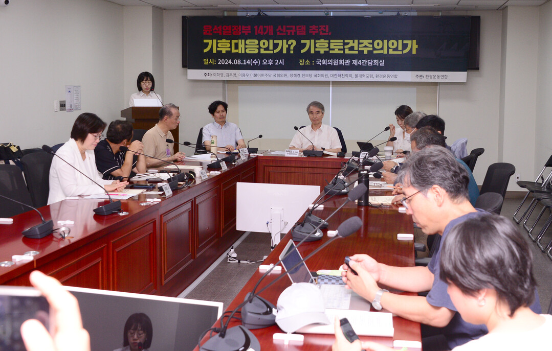 14일 국회 간담회장에서 윤석열정부 14개 신규댐 추진을 제목으로 긴급 토론회를 열었다. 토론회는 더불어민주당 이학영, 김주영, 이용우, 진보당 정혜경 의원, 대한하천학회, 물개혁포럼 주최, 환경운동연합이 주관했다.