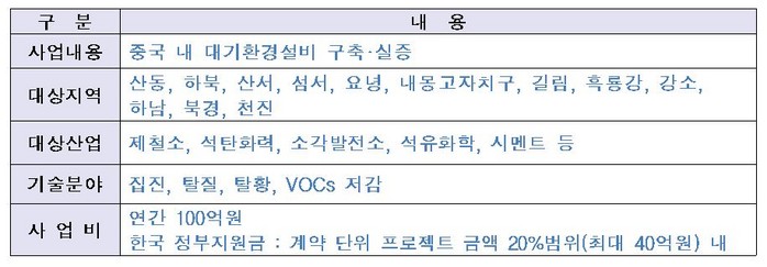 이 사업은 2014년 7월 한중 정상회담 합의에 따른 후속조치로, 우리나라 우수 대기오염 방지기술을 중국 대기환경설비에 적용해 양국 공동 현안인 미세먼지 저감 해결을 위한 2015년부터 추진해왔다.