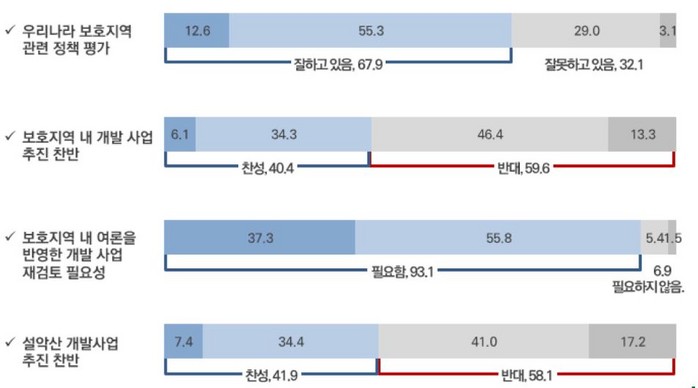 응답자의 67.9%는 우리나라가 자연생태계나 문화적 가치가 우수한 지역을 보호지역으로 지정·관리하는 정책에 대해 '잘하고 있다'고, '관광활성화 등의 명목으로 보호지역 내에 국가나 지방정부가 개발사업을 추진'문제는 반대가 59.6%로 찬성 40.4%보다 높게 응답했다.