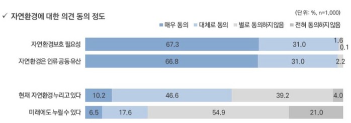 '난개발로 자연 훼손됐다고 생각하는지' 질문에 93.2%가 '그렇다'고 했다. '현재의 자연환경을 충분히 누리고 있는지'에 물음에 56.8%만이 '그렇다'고 했고, '현재의 자연환경을 미래에도 누릴 수 있다고 생각' 질문에서 75.9%가 '그렇지 않다'라고 답해 현재보다 미래의 자연환경이 나빠질 것을 우려하고 있었다.