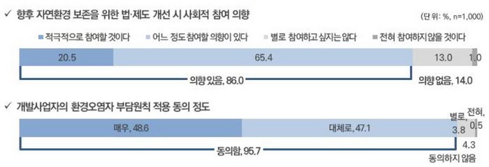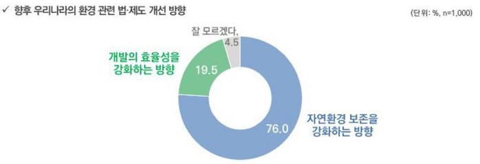 향후 우리나라 환경 관련 법·제도 개선방향을 묻는 질문 '자연환경 보존을 강화하는 방향'(76.0%). '개발의 효율성 강화 방향’(19.5%), '잘 모르겠다'(4.5%)로 나타났다. 향후 자연환경 보존을 위한 법·제도 개선 시 사회적 참여 의향 질문에 '적극 참여 혹참여 의향 있다' 응답자는 86%였다.
