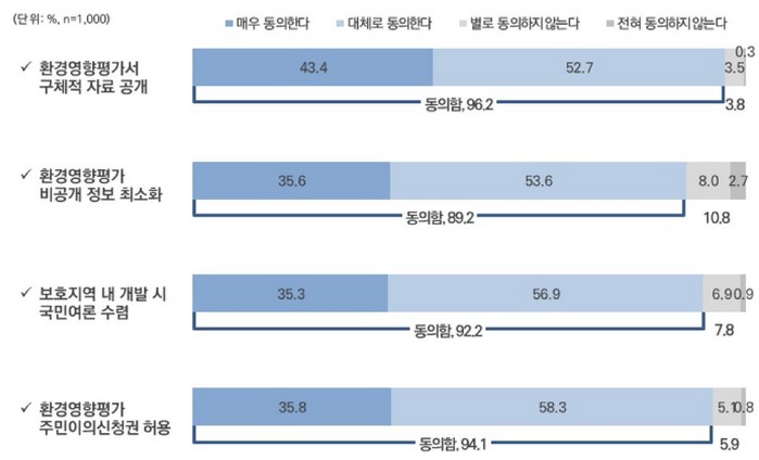 또한 '국민도 평가서 이해와 의견 제시할 제도 도입'"에 93.4%가 찬성했다. 국가적 차원에서 지정·관리하는 '보호지역 내 개발사업에 대해 해당 주민뿐만 아니라 모든 국민 의견을 수렴해야 한다'는 의견에 92.2%가 동의했다.
