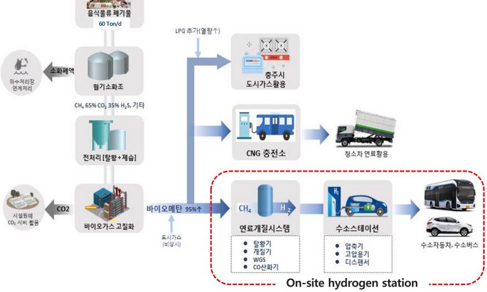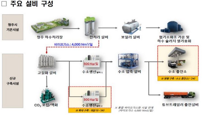 바이오가스 생산과정에서 발생한 CO2는 생물기원으로 온실가스 배출량 산정 제외한다. 이번 총사업비는 100억원(국고보조율 50%)이 투입된다. 사업 기간은 2023년부터 24년까지다. 이곳 시설 용량은 하루 수소 500kg을 생산 예정이다. 이번 협약은 3월 21일 민간보조 사업자로 선정된 현대자동차(청주시 소유 하수처리장)와 고등기술연구원, 한국환경공단, 환경부 등 관련 기관 간 역할과 책임을 정하기 위해 마련됐다.