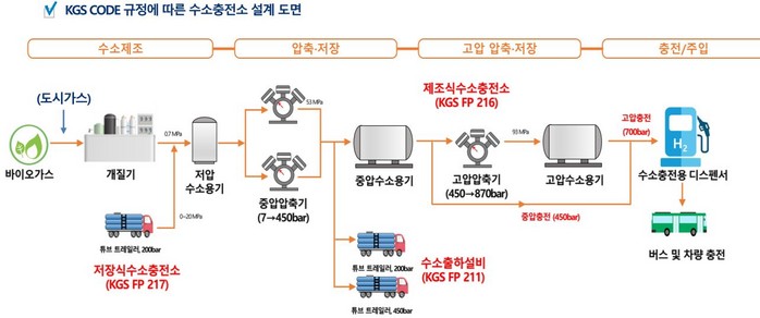 고등기술원이 밝힌 수소생산 설계를 보면 바이오가스 이용 듀얼압력 수소 공급이 가능한 수소융복합충전소 구축 및 실증이 곧 마무리할 예정이다. 하루 500kg의 수소(H2) 생산을 위한 통합공정 시스템 엔지니어링을 통해 700bar 수소버스(차) 충전서비스와 450bar 튜브트레일러 수소공급 시스템 구축한다는 로드맵을 마쳤다.