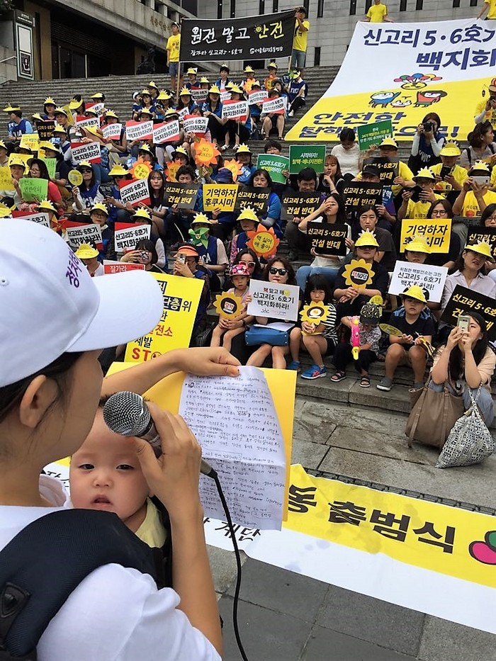 ▲갓난 아이가 무슨 죄, 엄마발언에 참여한 강미정 정치하는 엄마들 대표는 자신의 아이들 업고 나서 직접 쓴 낭독문을 읽으며 탈핵동참과 신고리 5,6 호기 건설 반대 입장 이유를 밝혔다. |