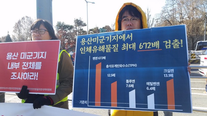 발암성이 높은 톨루엔, 에틸벤젠, 크실렌도 기준치를 모두 초과했다. 삼각지역 인근의 캠프킴 지역 오염도 여전히 진행형이다. 한국 정부 역시 그동안 환경오염조사 결과조차 미군 측이 합의해주지 않는다는 이유로 공개를 거부하는 등 국민의 건강권과 알권리를 철저히 무시했다. 용산미군기지는 이미 반환된 기지의 오염정화 비용과 비교했을 때, 1조원 이상의 오염정화 비용이 발생할 가능성이 있다.