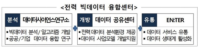 이번에 문을 연 전력 빅데이터 융합센터는 전력 빅데이터를 분석하는 데이터사이언스연구소, 데이터를 활용하도록 개방하는 전력데이터공유센터와 데이터서비스를 유통하는 에너지마켓플레이스(EN:TER) 포털로 구성됐다.