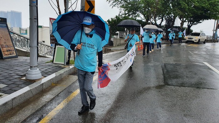 오늘 4일 전라남도 목포에 도착한 한백평화포럼 집행부와 목포시 포럼 회원들은 간간히 내리를 빗줄기 속에서 약속된 거리 만큼 걸었다.