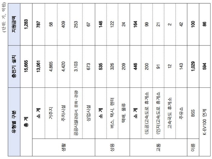 사업 유형별로 구분하면 ▲공동주택, 주차시설 등 생활거점에 1만 3002기(783억 원) ▲전기화물차, 택시 등 상용차 거점에 535기(146억 원) ▲고속도로 휴게소, 주유소 등 교통 요충지에 446기(164억 원) ▲전기이륜차 배터리 교환형충전기 1029기(100억 원) 등으로 나타났다.